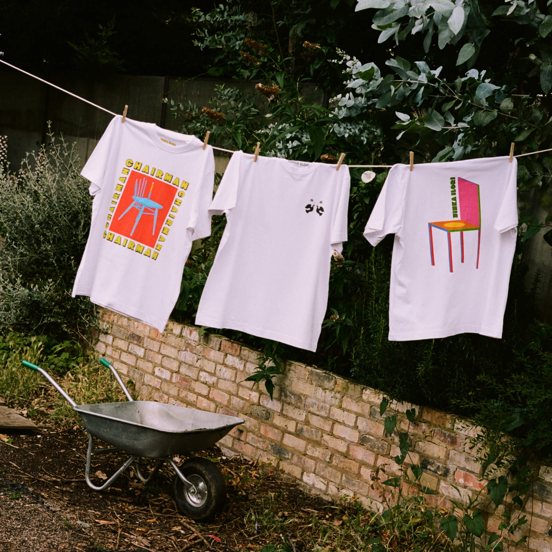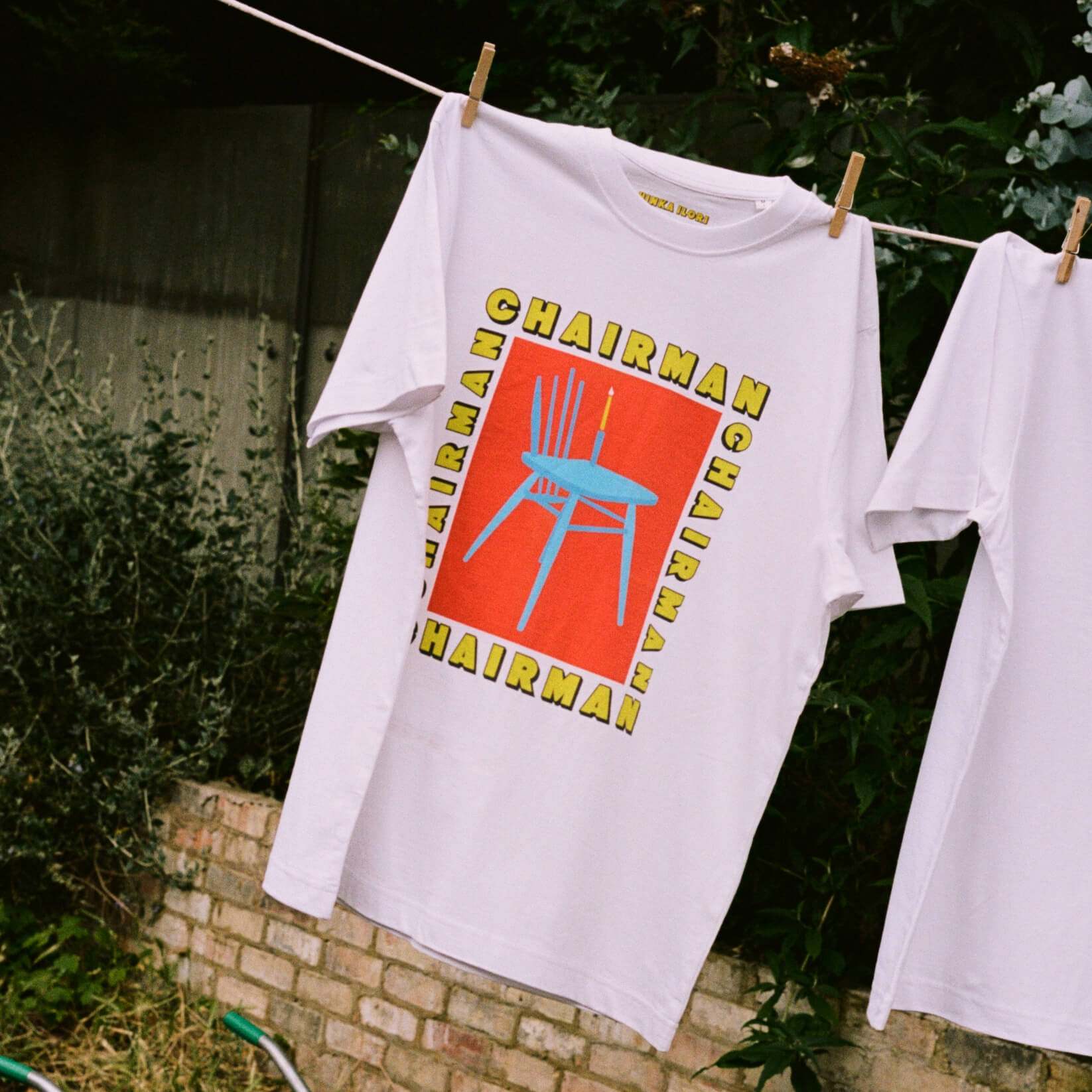 Yinka Ilori launches a new edition of the Chairman t-shirt. The new design titled 'Let There Be Light' features one of Yinka's iconic chairs against a crisp white base colour. The t-shirt celebrates Yinka's early career up-cycling chairs and his fascination with furniture as a vehicle for storytelling.