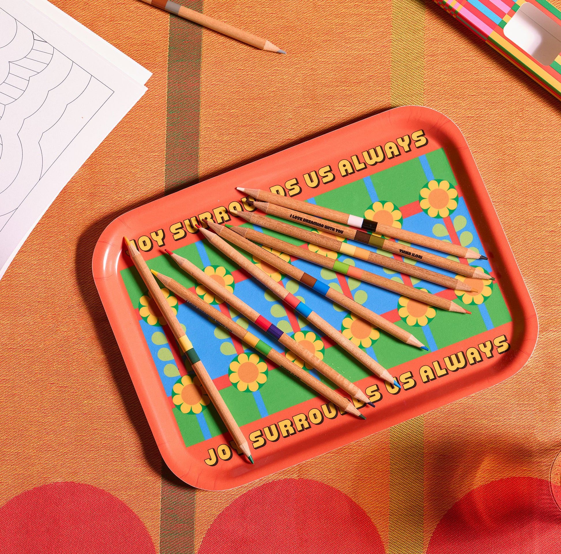 This vibrant tray celebrates the power of imagination. Inspired by the joy of play, the artwork reflects the ways creativity and connection can grow from even the simplest rituals. Blossoming motifs symbolise ideas taking shape, while the bold composition captures the beauty of passing delight from one generation to the next.