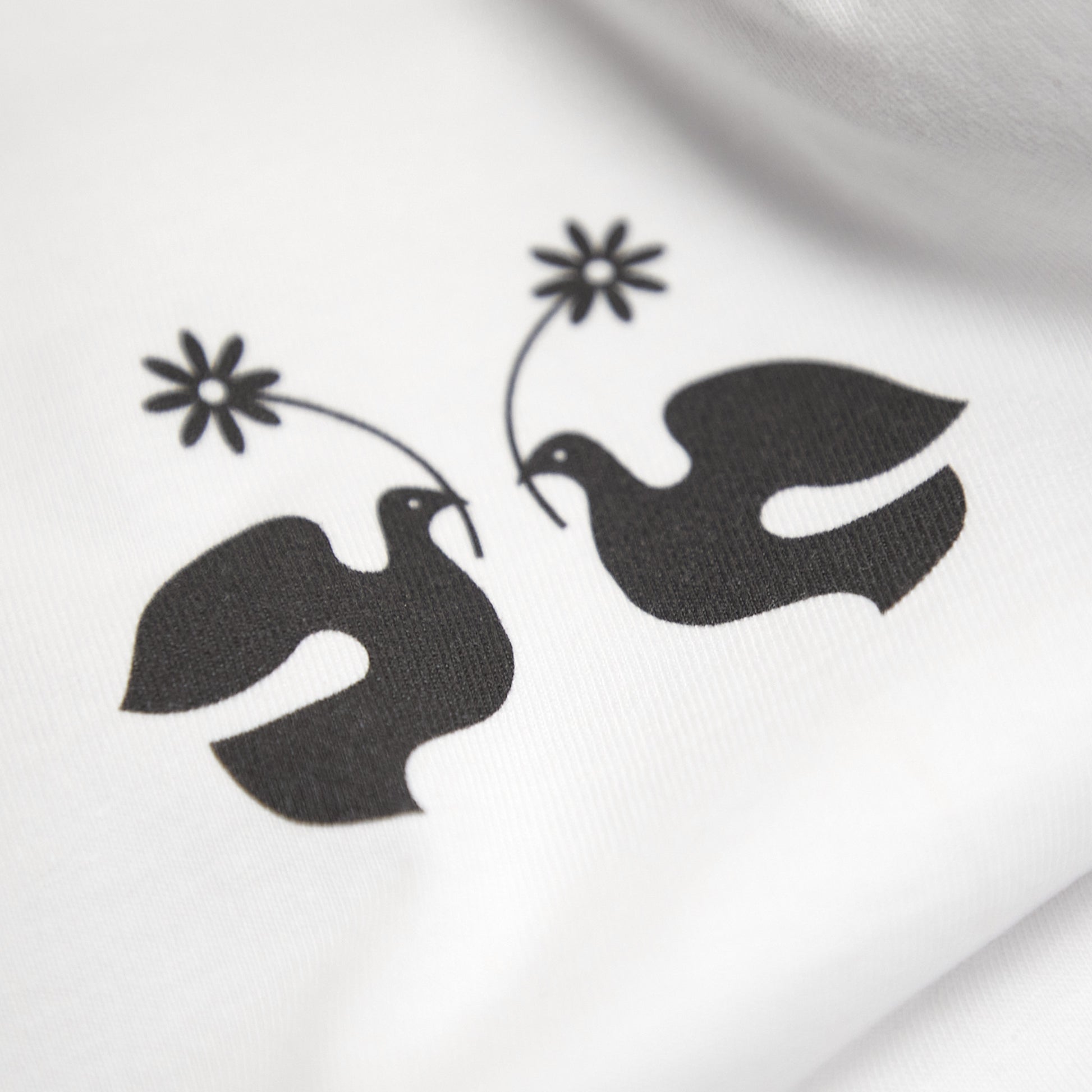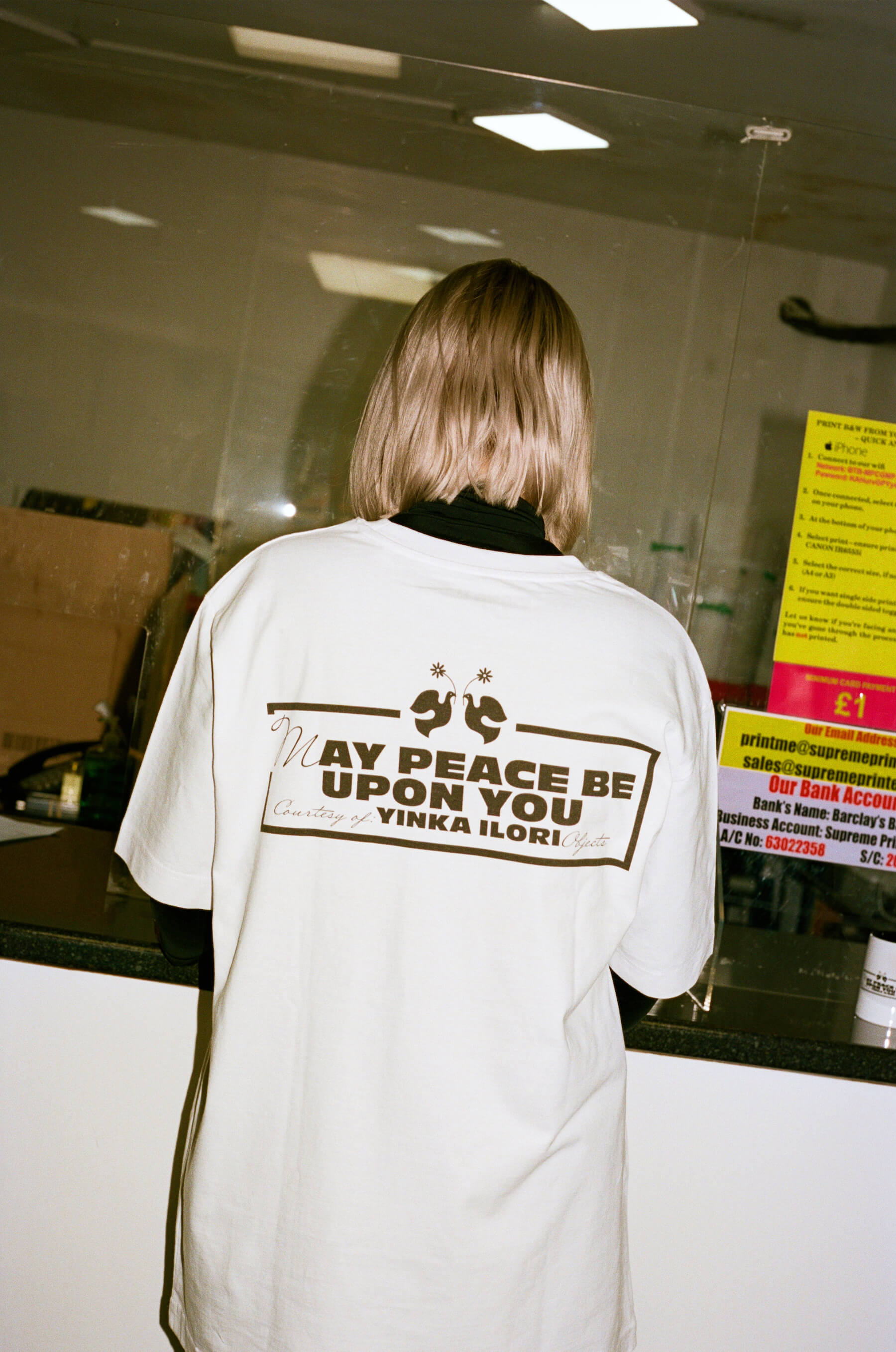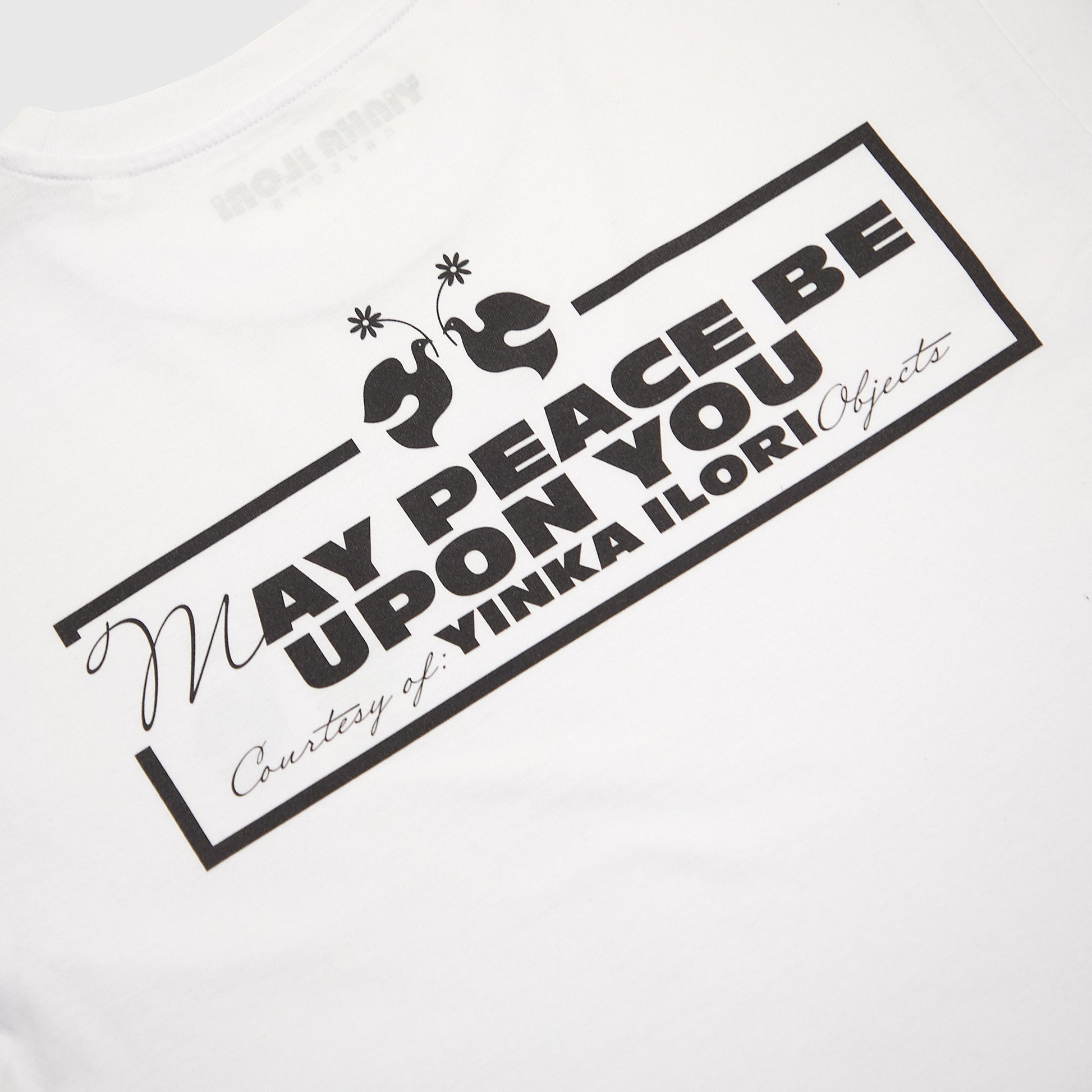 Different from any artwork Yinka has shared before, MAY PEACE BE UPON YOU is void of colour, vibrancy, or pattern. Instead, the black and white design is imbued with depth and sentiment, free from distraction. Doves are featured on the front and back of this T-shirt as a symbol of peace, love and hope – a reminder to take moments of stillness and seek joy within.