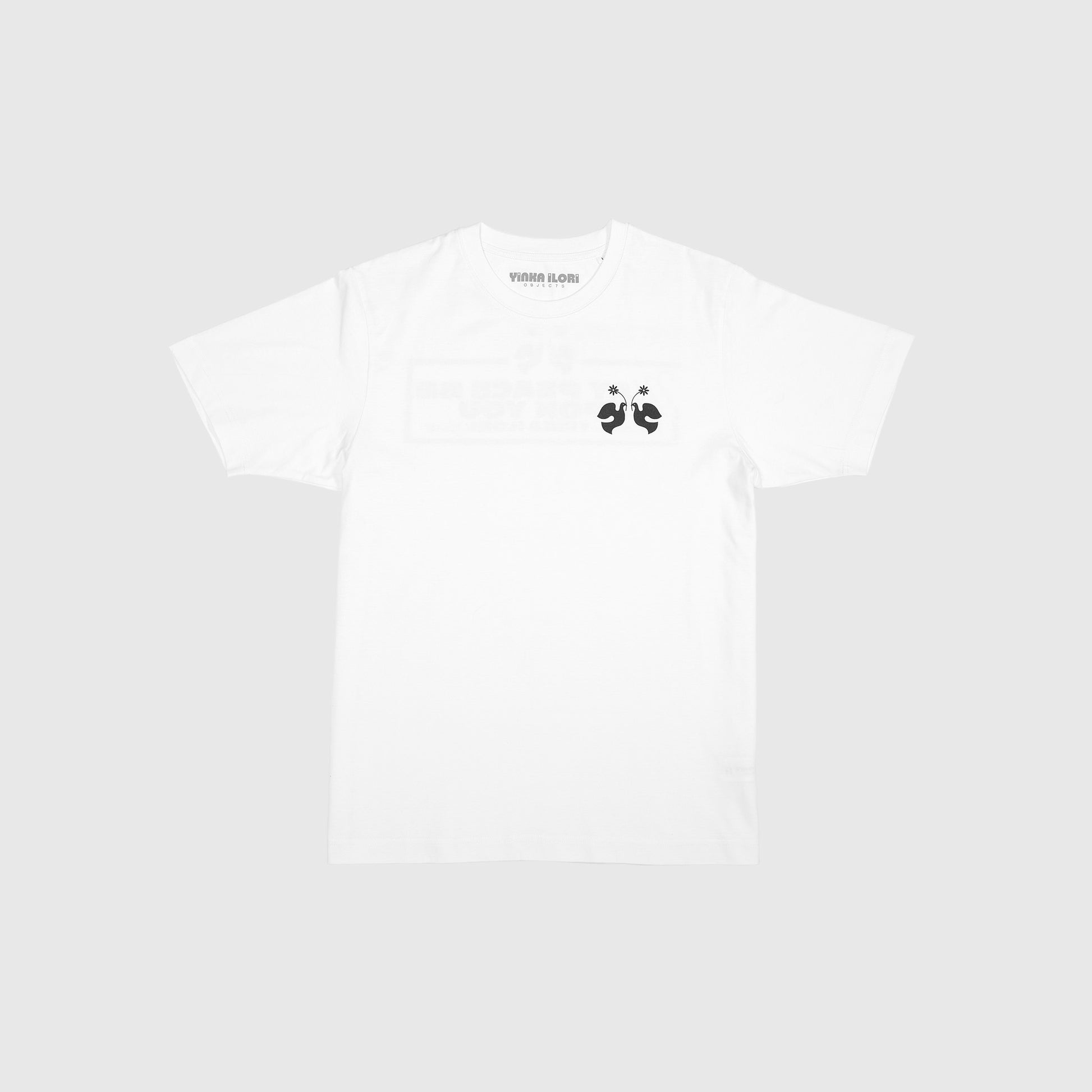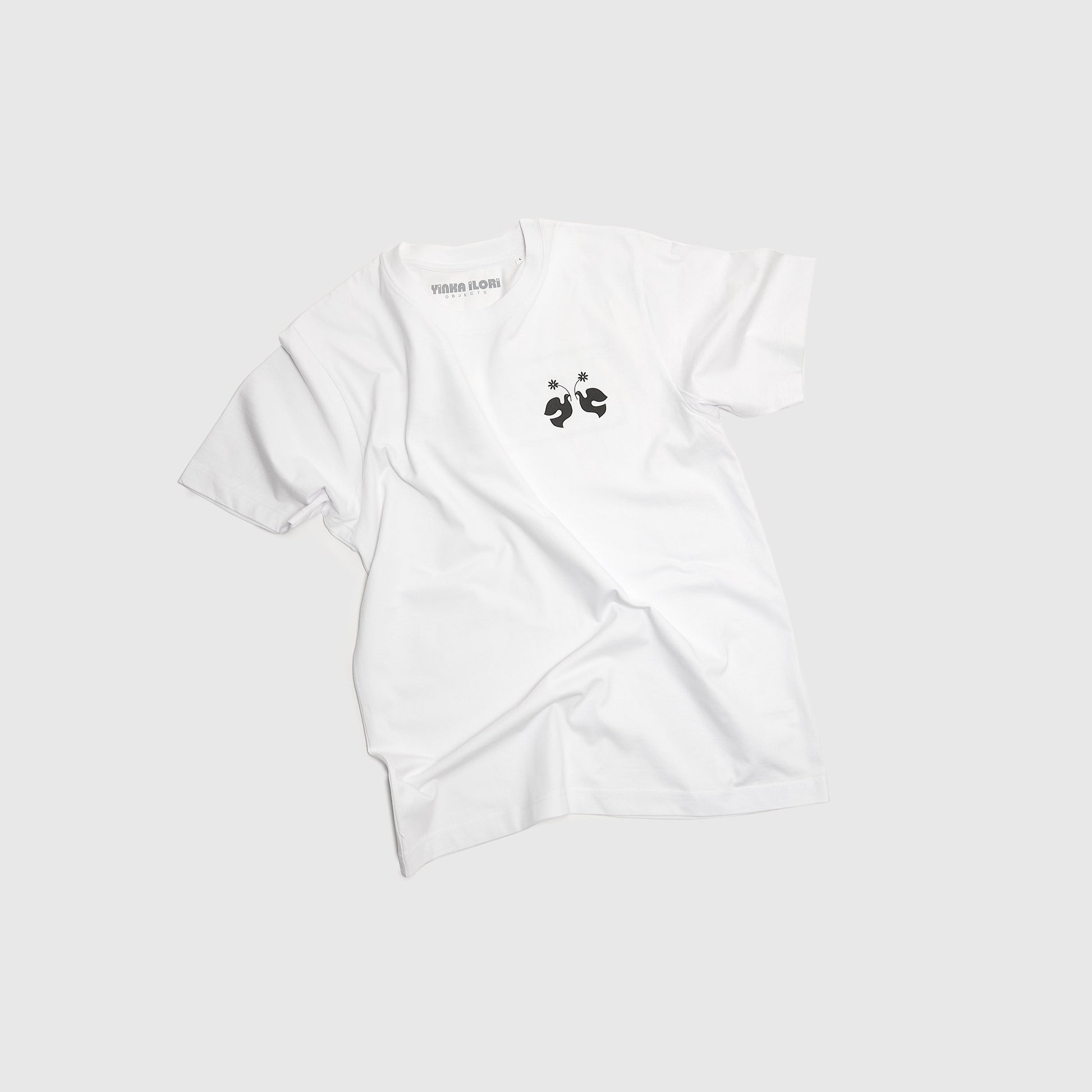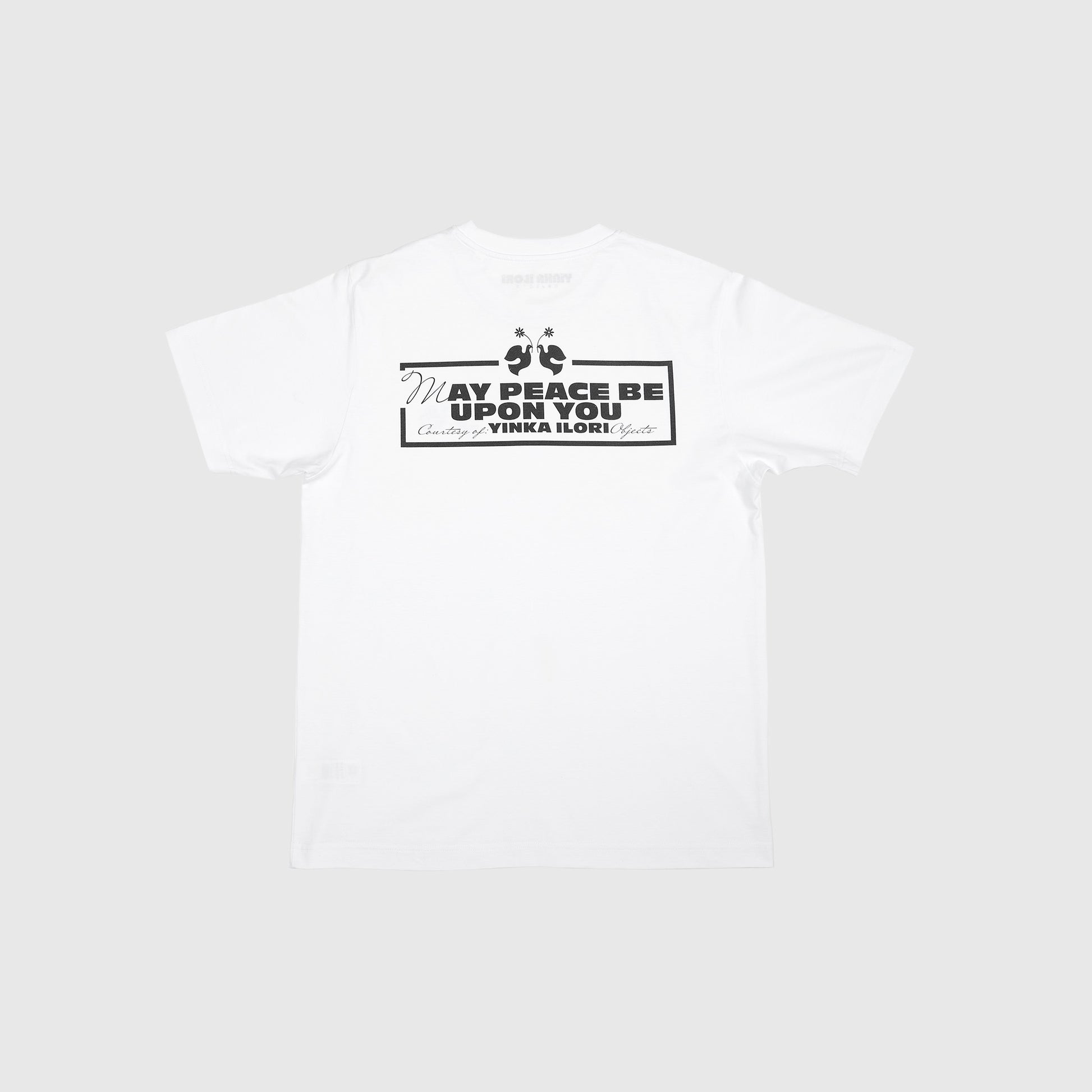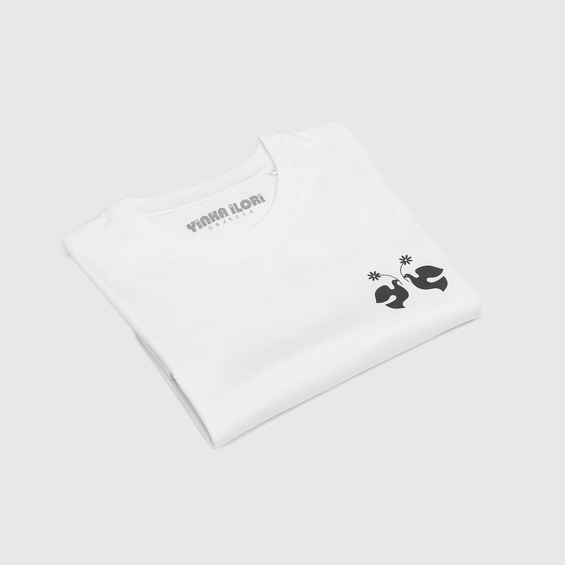 Different from any artwork Yinka has shared before, MAY PEACE BE UPON YOU is void of colour, vibrancy, or pattern. Instead, the black and white design is imbued with depth and sentiment, free from distraction. Doves are featured on the front and back of this T-shirt as a symbol of peace, love and hope – a reminder to take moments of stillness and seek joy within.